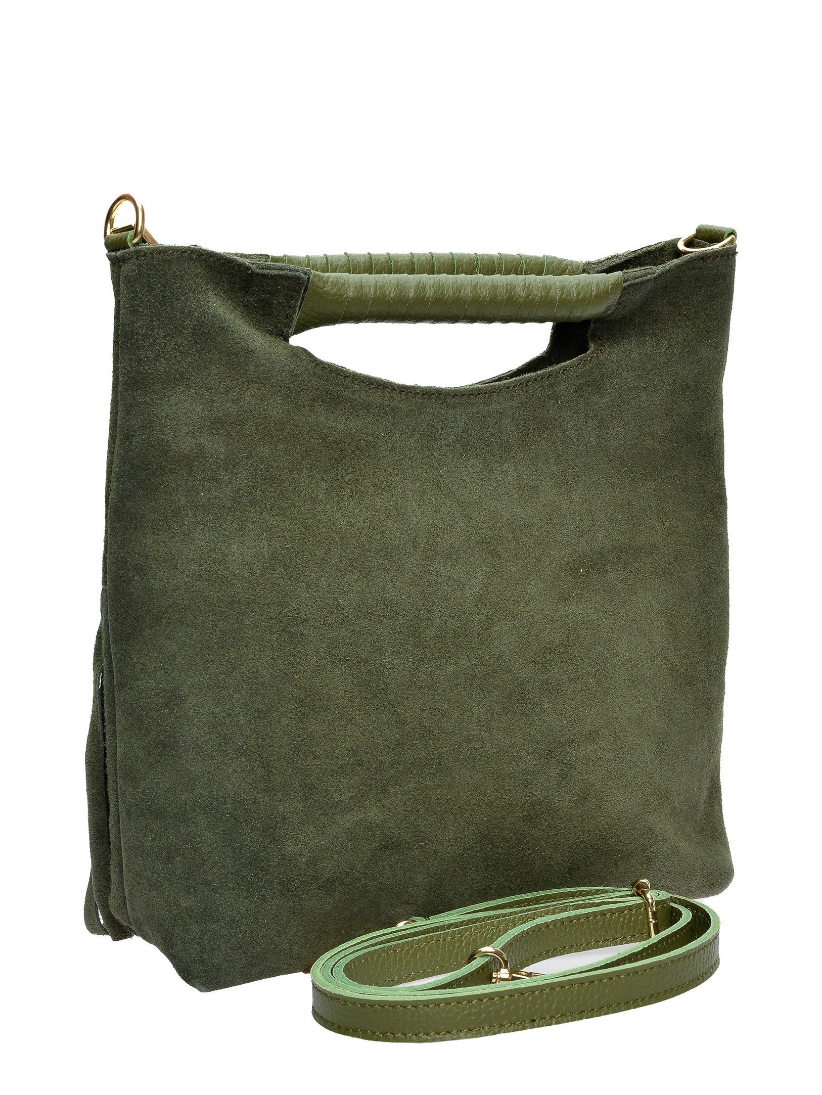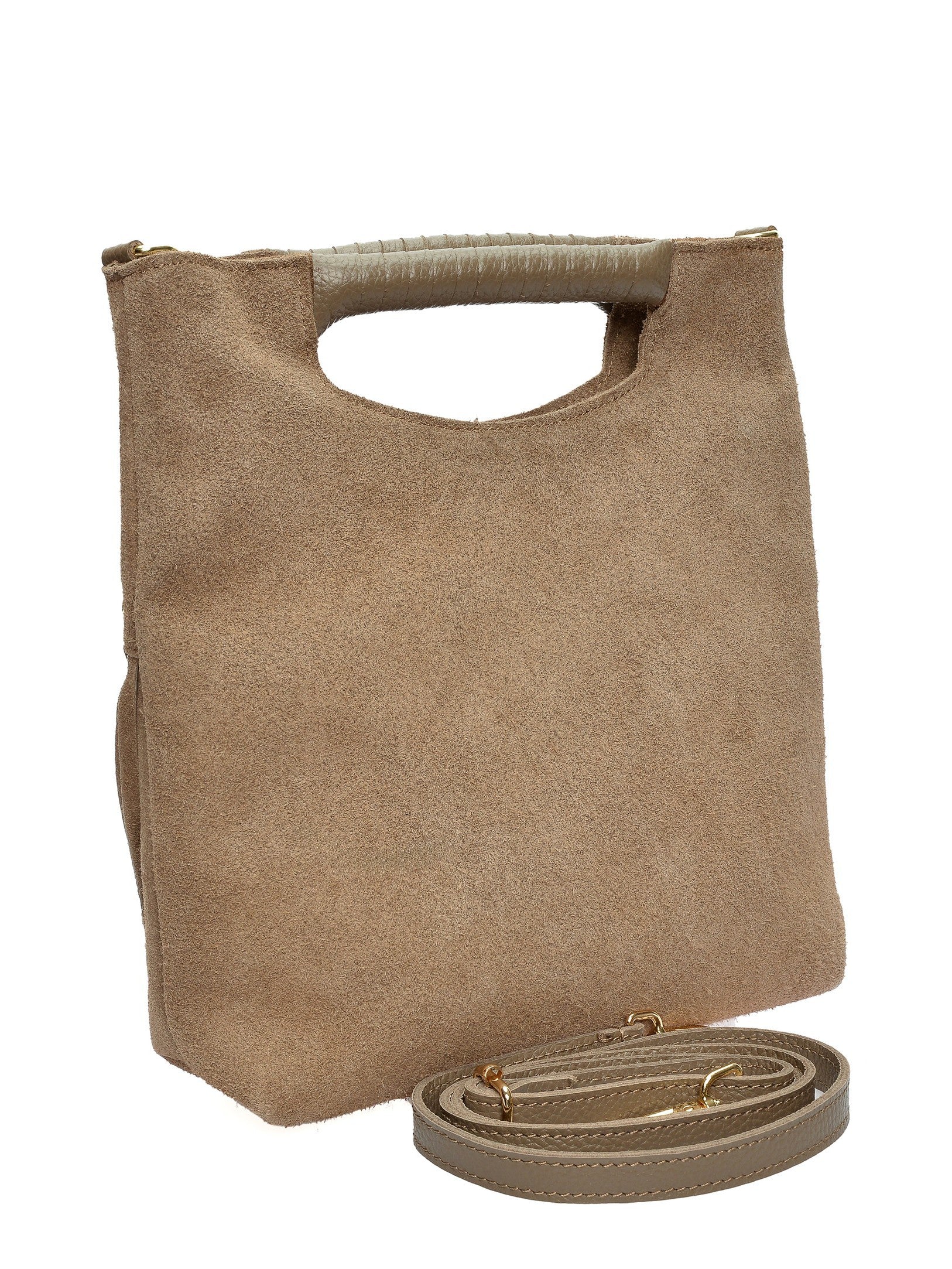 Eine stilvolle Handtasche aus feinstem Wildleder mit Magnetverschluss. Das Fransen- und Nietendetail verleiht dieser Tasche einen einzigartigen Boho-Look.