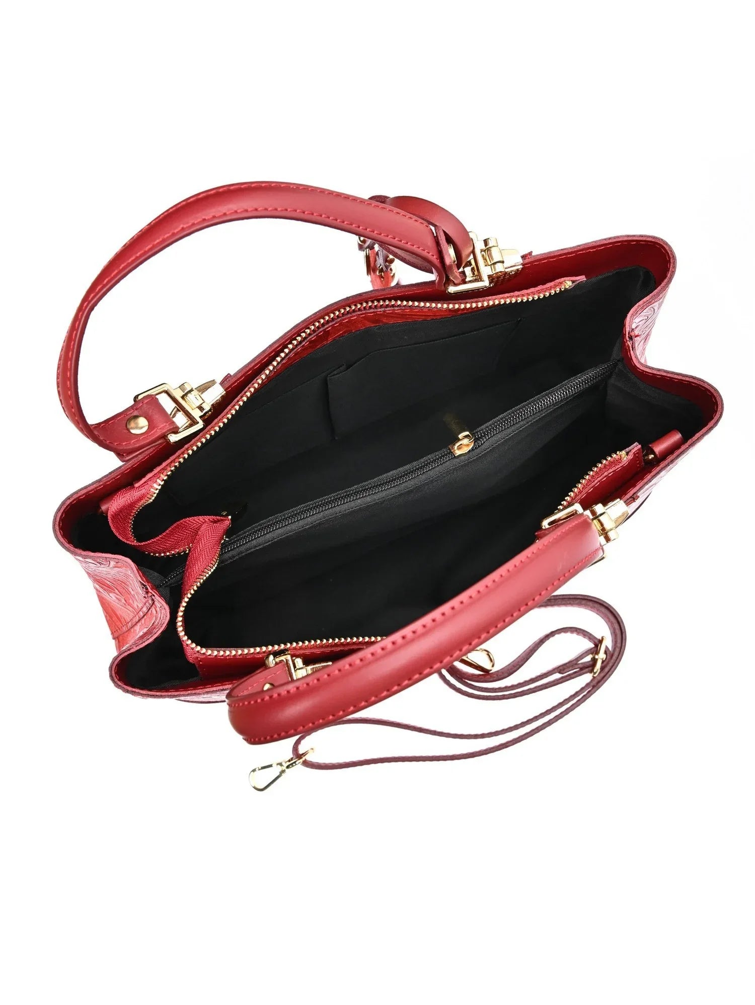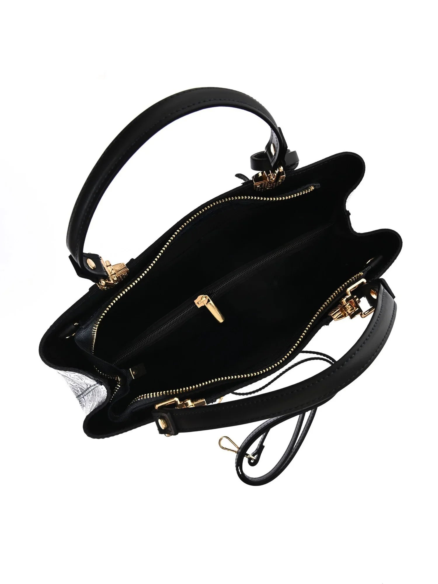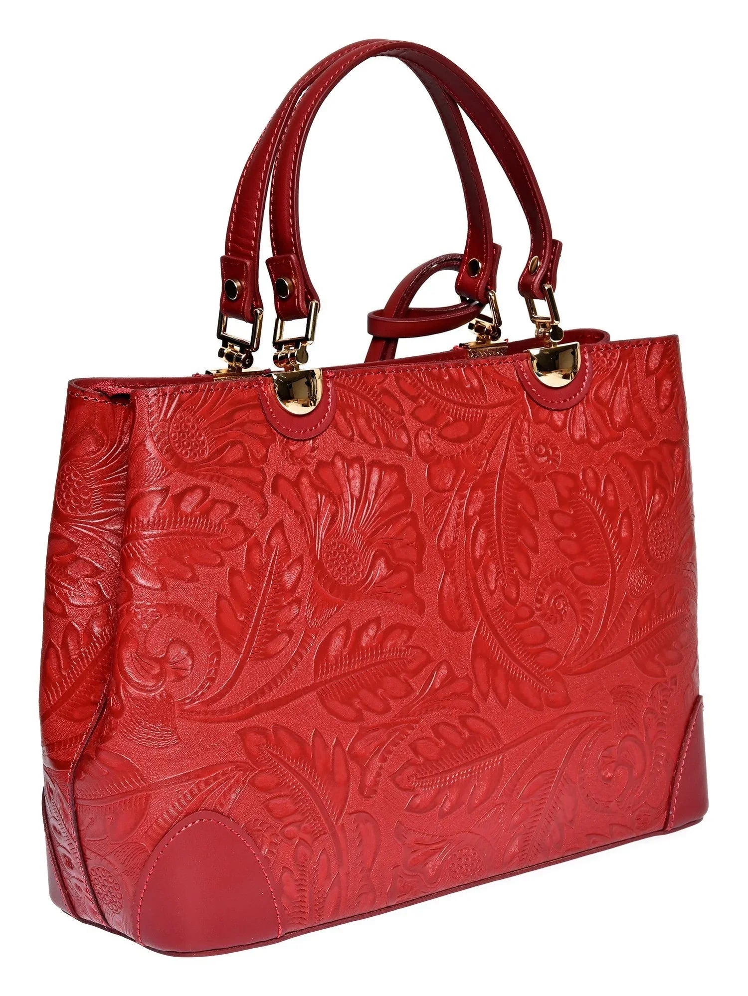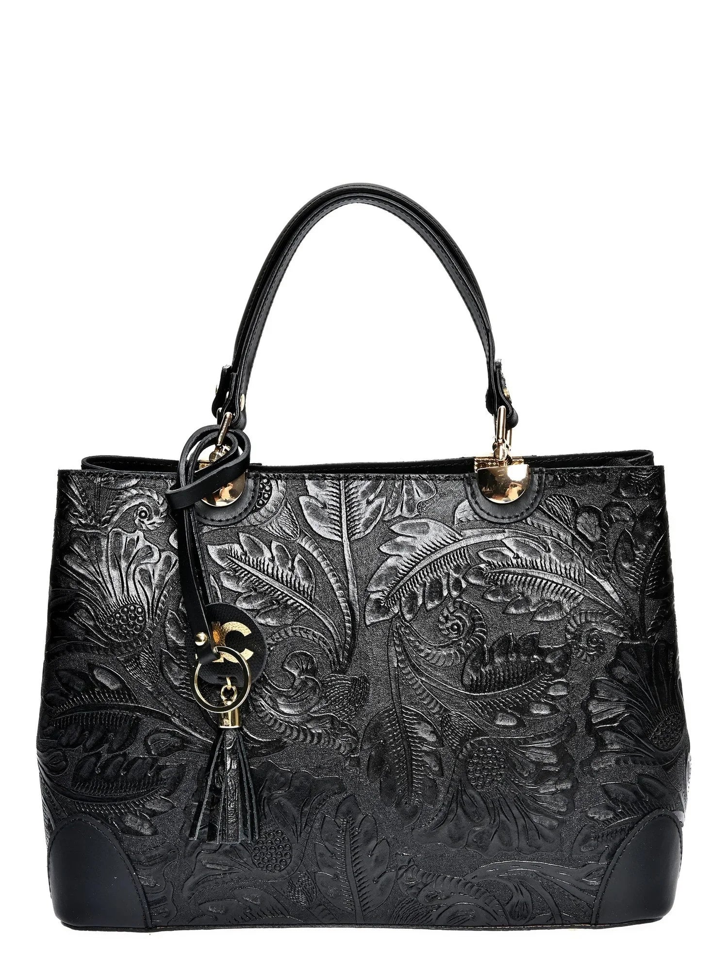 Eine stilvolle Handtasche aus feinstem Rindsleder mit raffinierten Details. Das Blattdruck-Detail, Quasten und Nieten-Füße verleihen dieser Doppelfachtasche einen einzigartigen, eleganten Charakter.