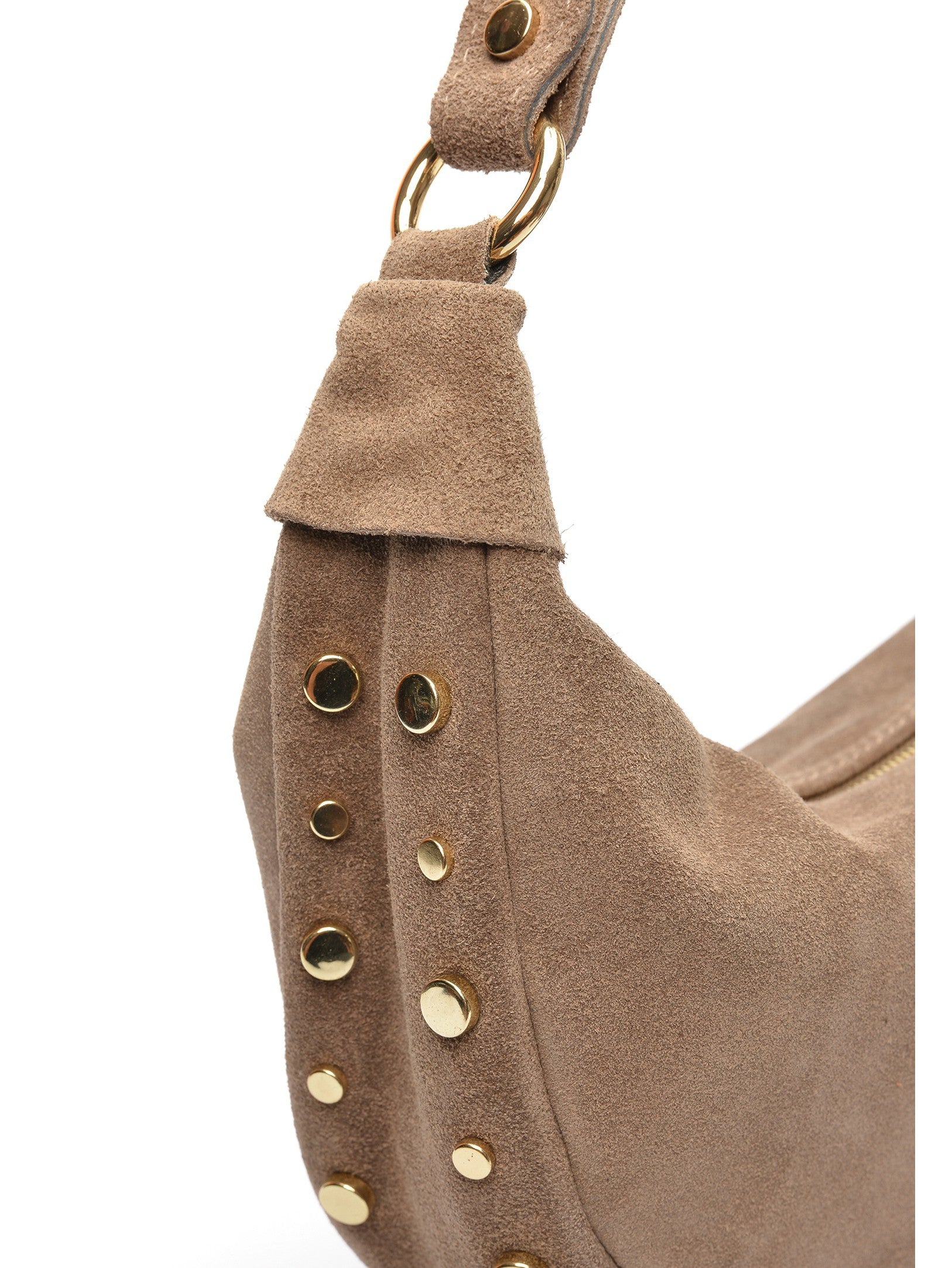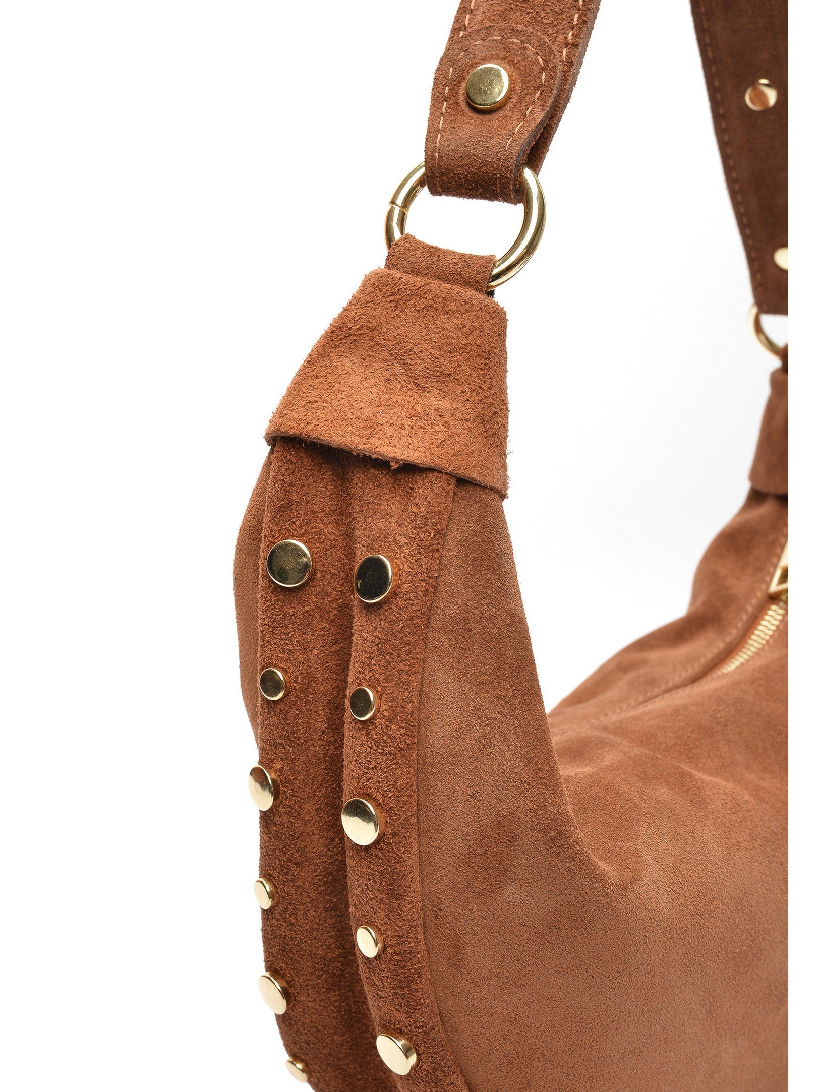 Eine lässige Hobo-Tasche aus luxuriösem Wildleder mit praktischem Reißverschluss. Das schwarze Stoffinnenfutter mit Reißverschlusstasche und die goldfarbenen Beschläge mit Ösendetail am Henkel verleihen dieser Tasche einen eleganten Look.