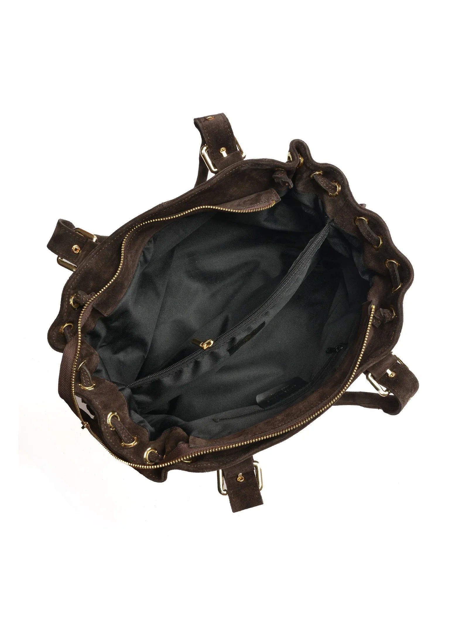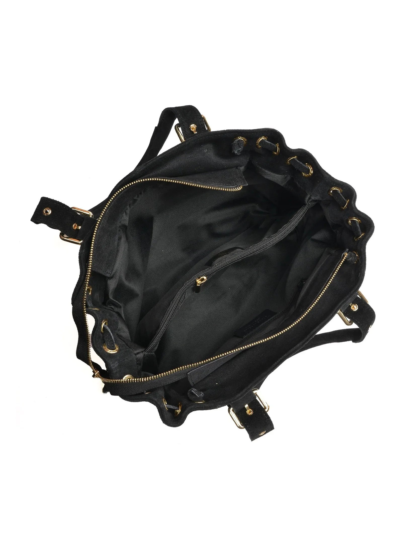 Eine lässige Henkeltasche aus luxuriösem Wildleder mit seitlichem Kordelzugdetail. Das stoffgefütterte Innenfutter und der verstellbare Schulterriemen machen diese Tasche zum perfekten Begleiter für jeden Tag.