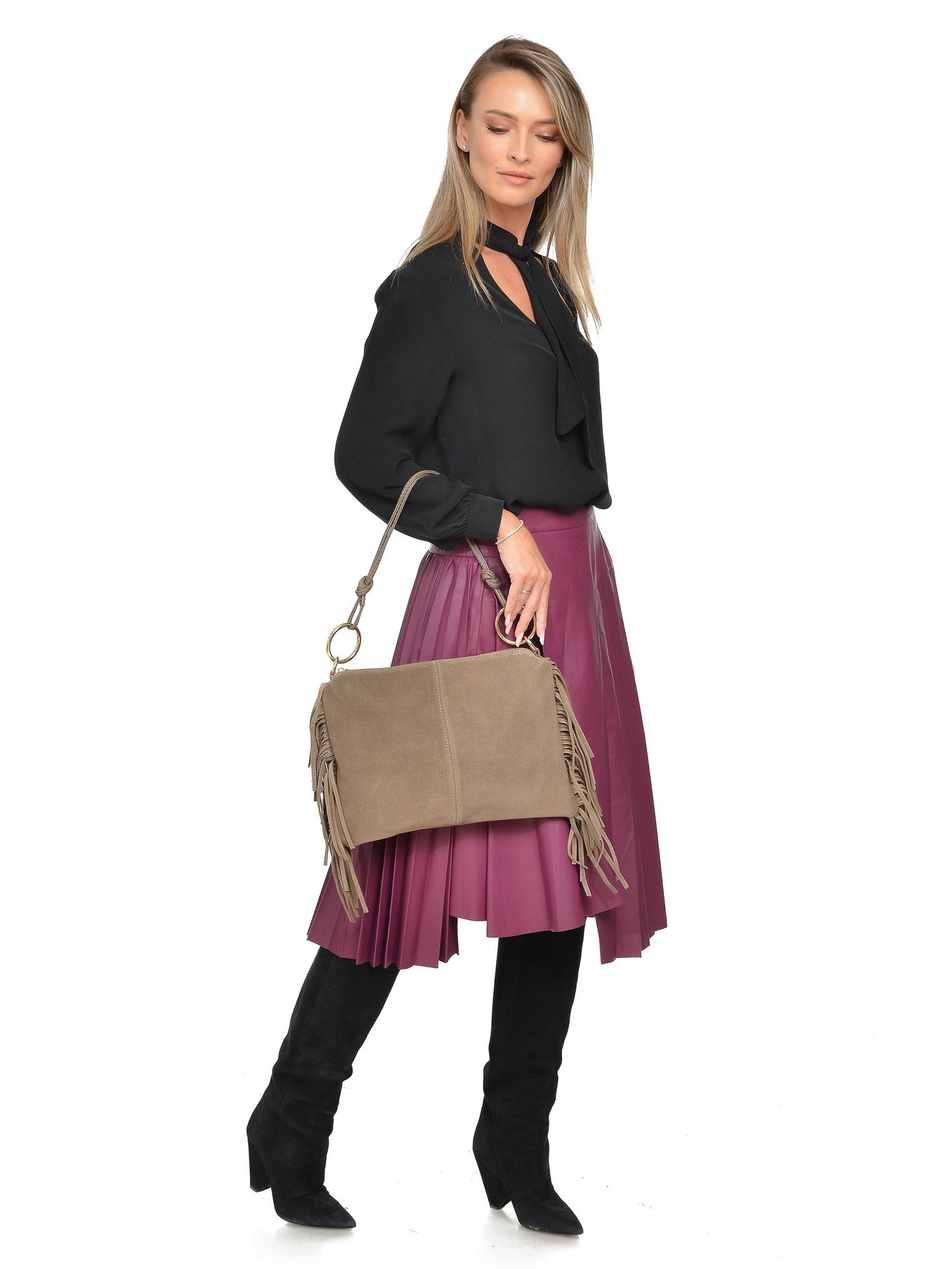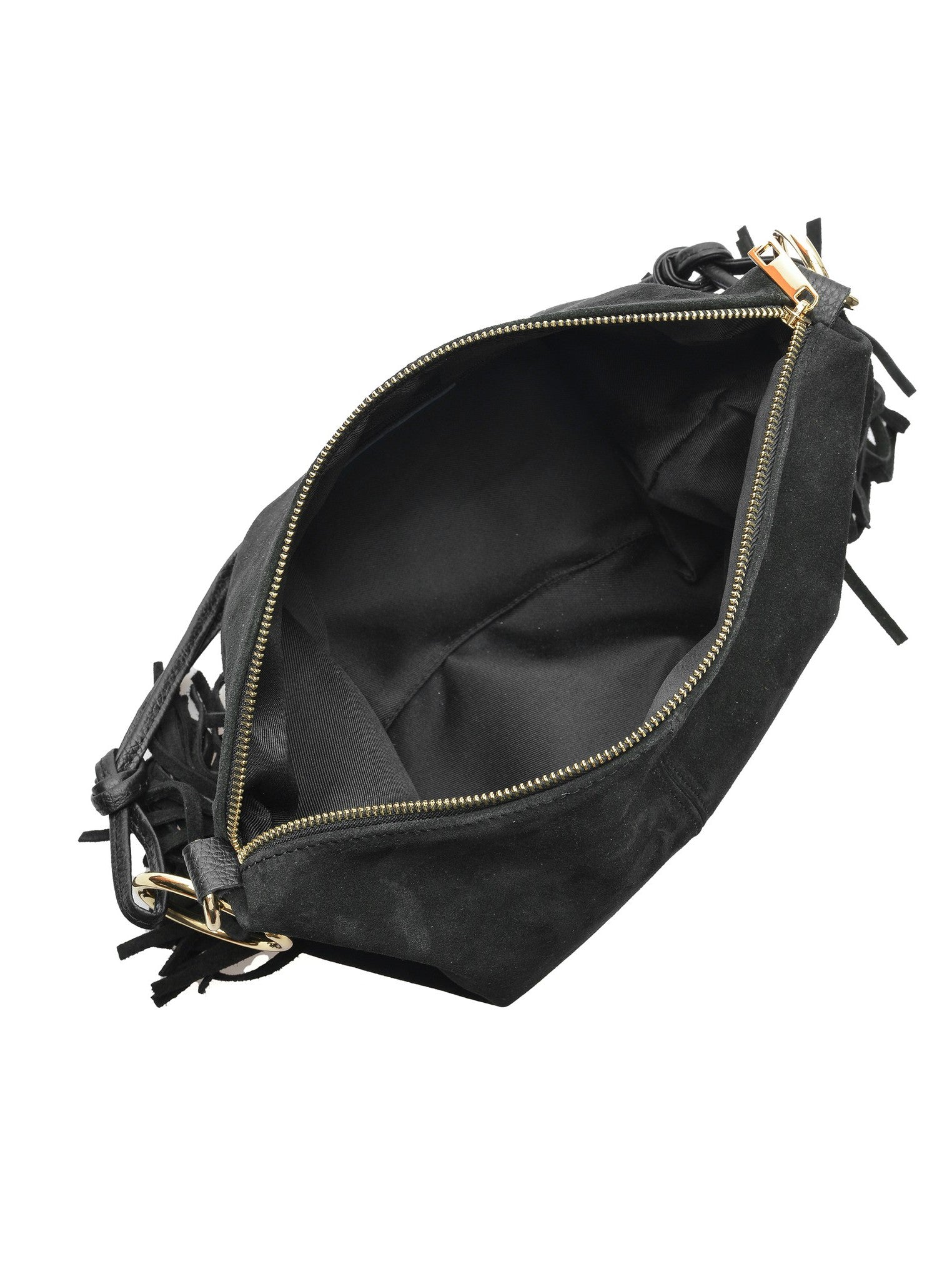 Eine lässige Umhängetasche aus luxuriösem Wildleder mit verspielten Fransen-Details. Der abnehmbare Schultergurt und die goldfarbenen Ringbefestigungen verleihen dieser Tasche einen einzigartigen Bohemian-Charme.