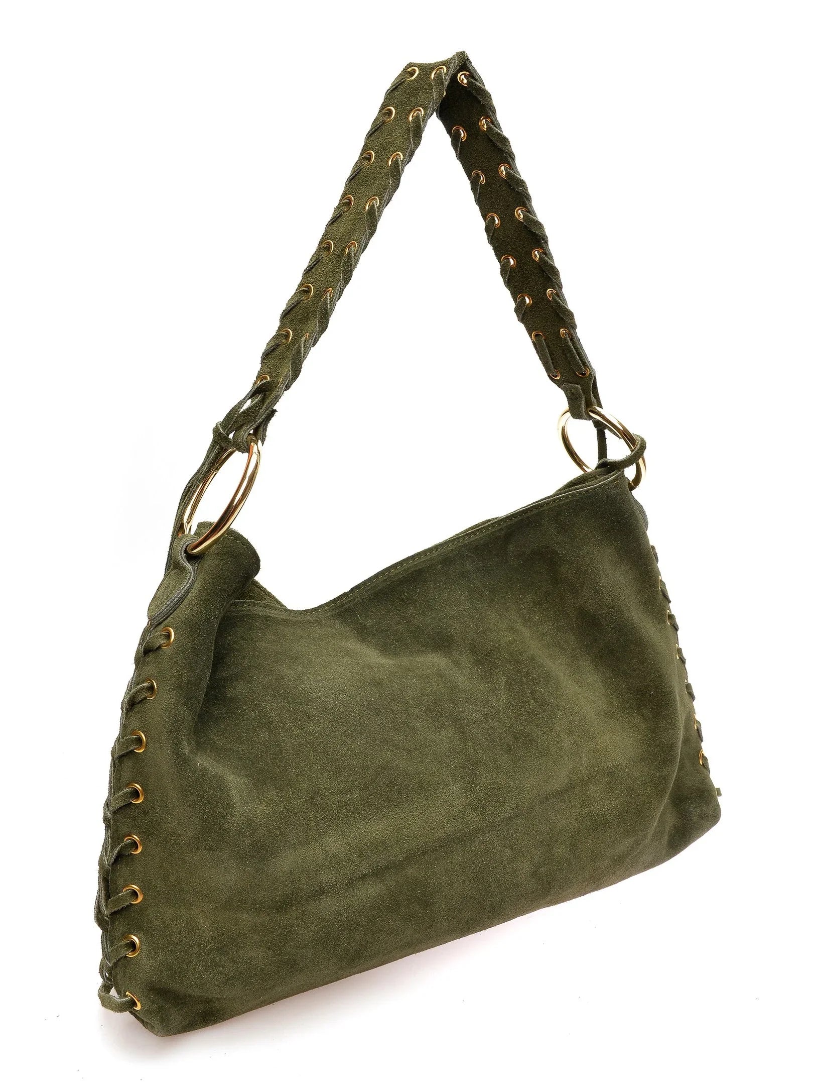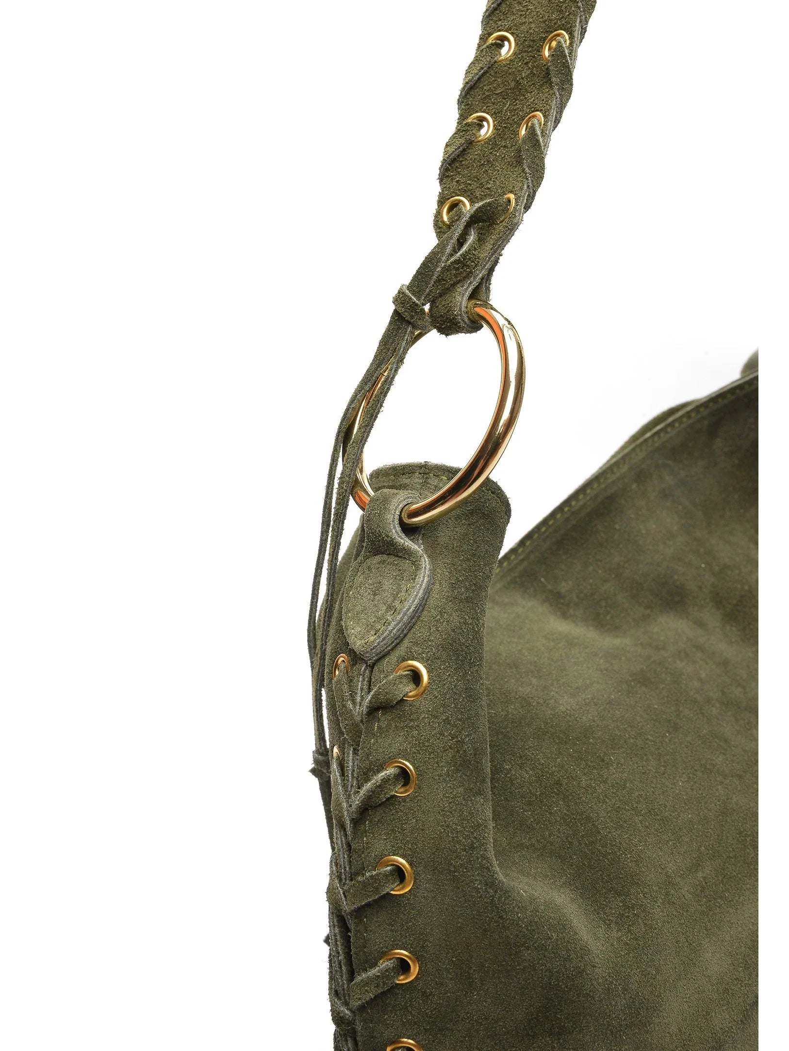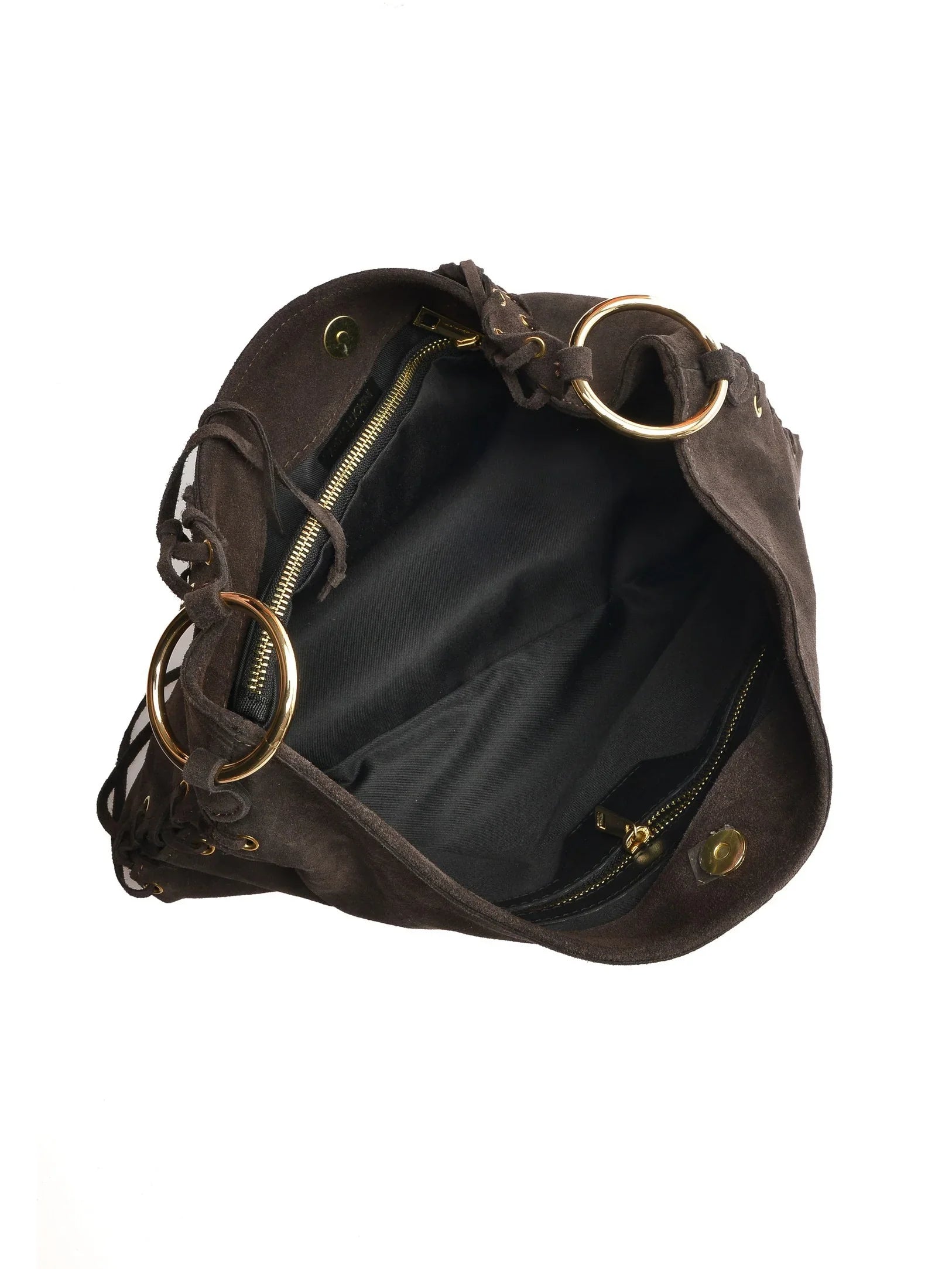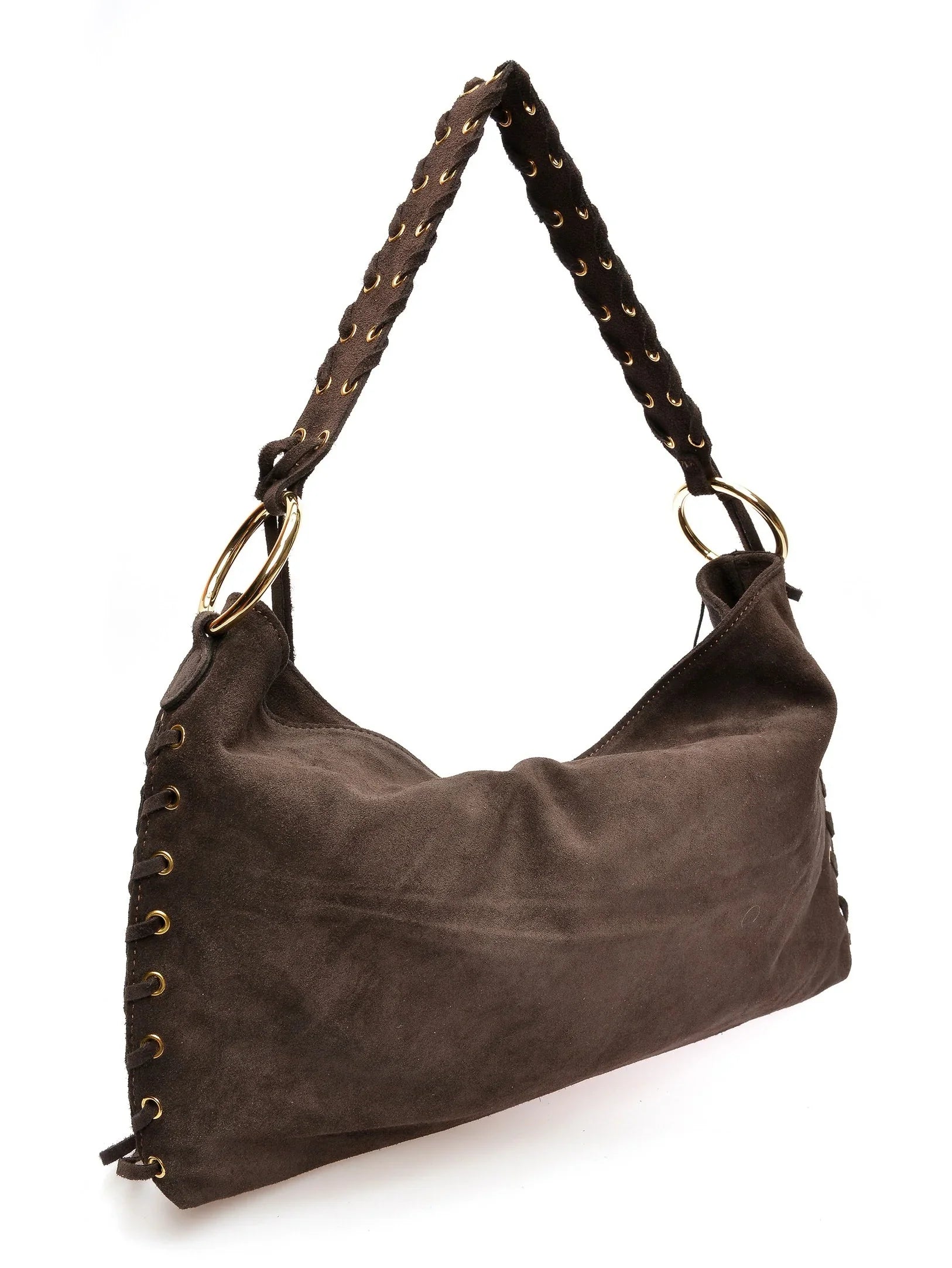 Eine großzügige Umhängetasche aus luxuriösem Wildleder mit geflochtenem Schulterriemen und Ringdetail. Der Magnetverschluss mit Reißverschluss und das stoffgefütterte Innenfutter bieten sichere Aufbewahrung für Ihre Wertsachen.