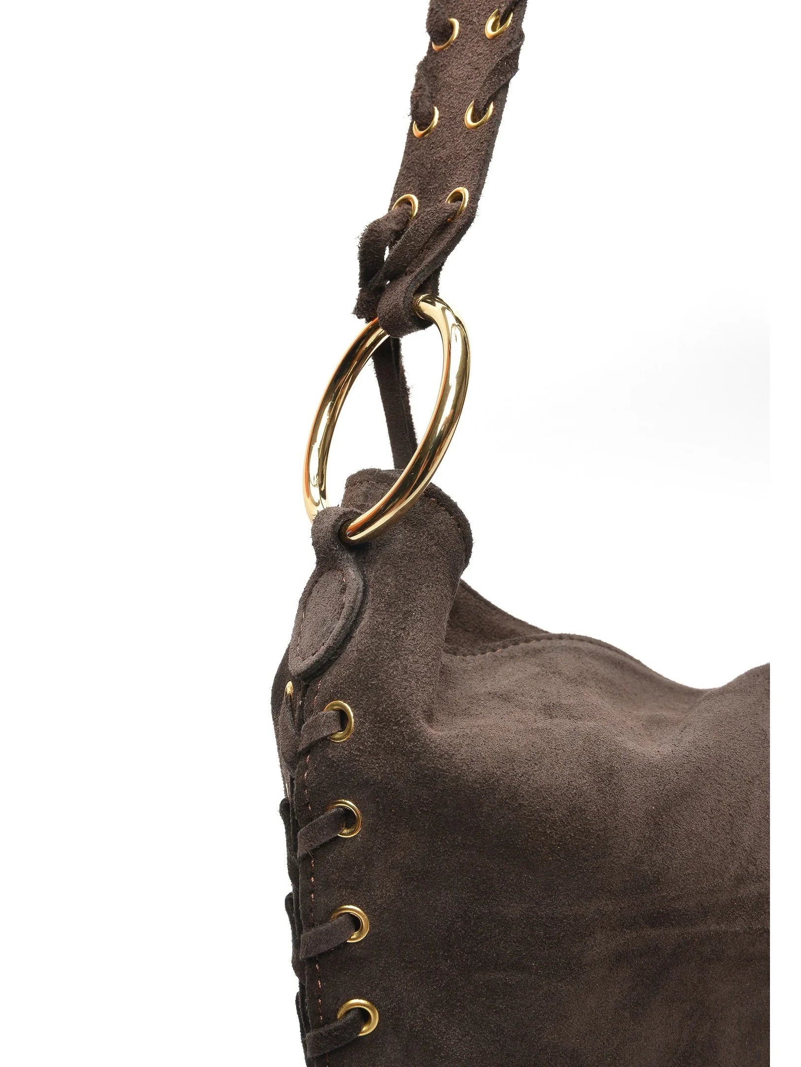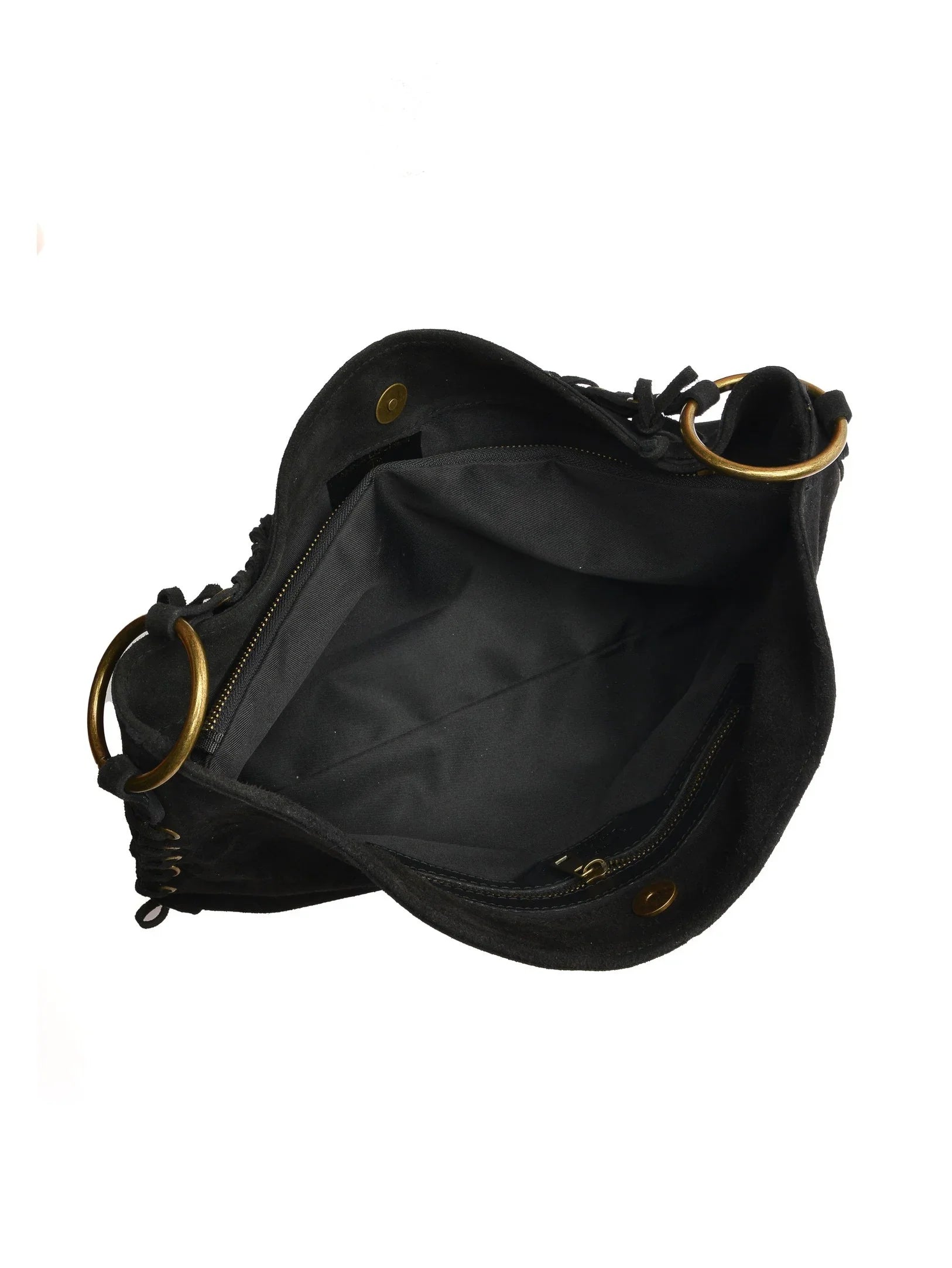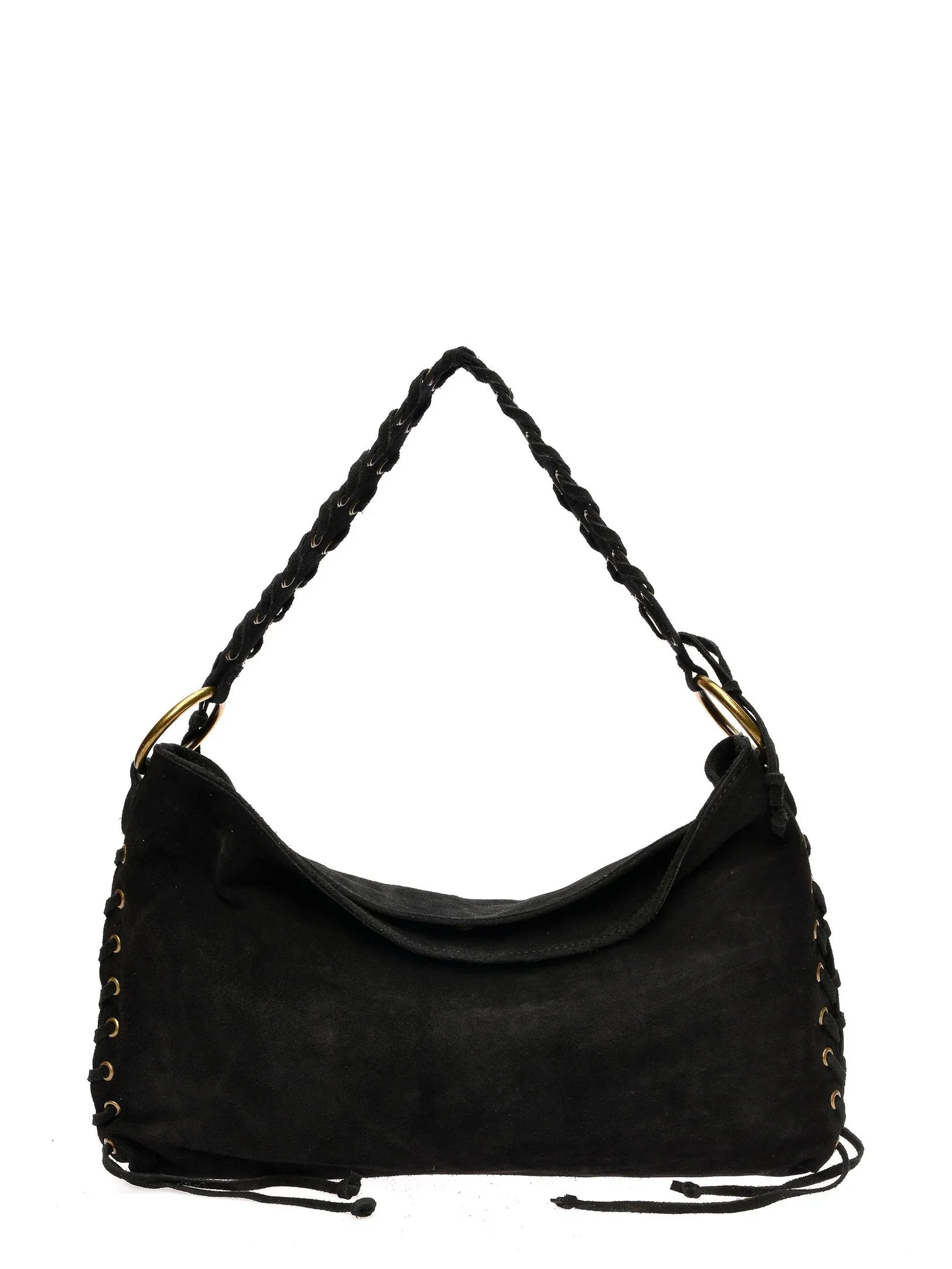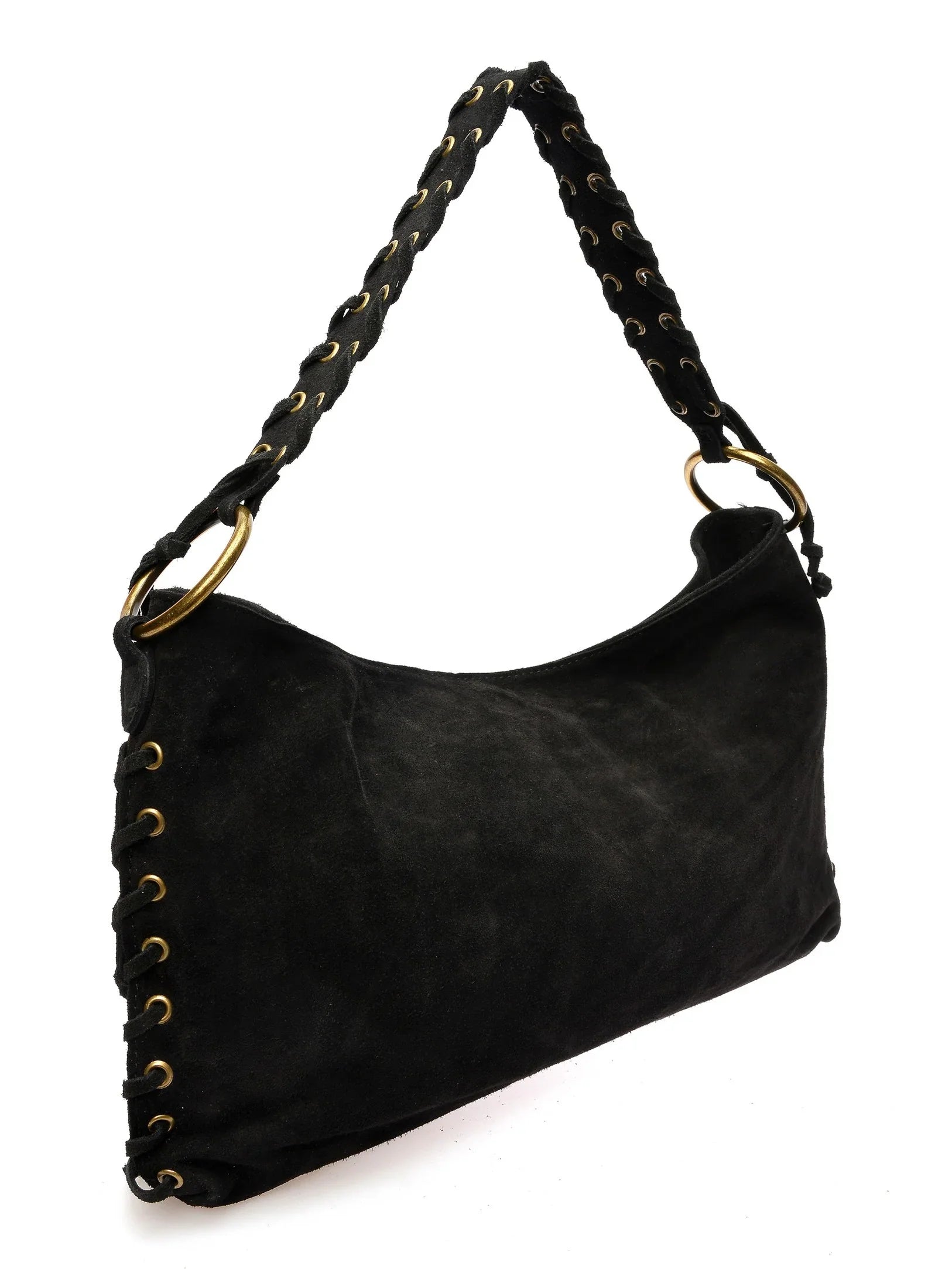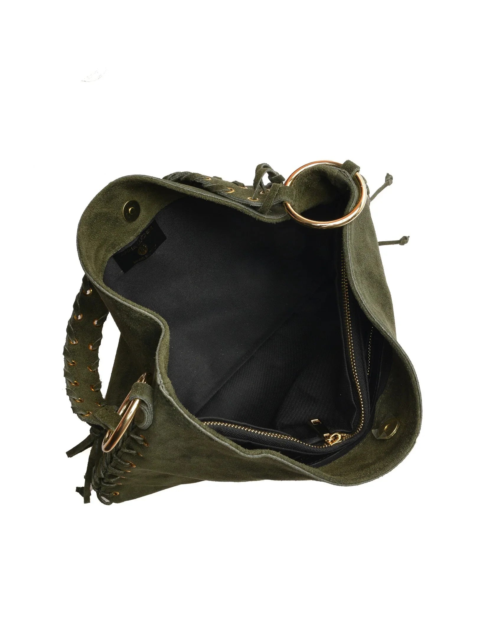 Eine großzügige Umhängetasche aus luxuriösem Wildleder mit geflochtenem Schulterriemen und Ringdetail. Der Magnetverschluss mit Reißverschluss und das stoffgefütterte Innenfutter bieten sichere Aufbewahrung für Ihre Wertsachen.