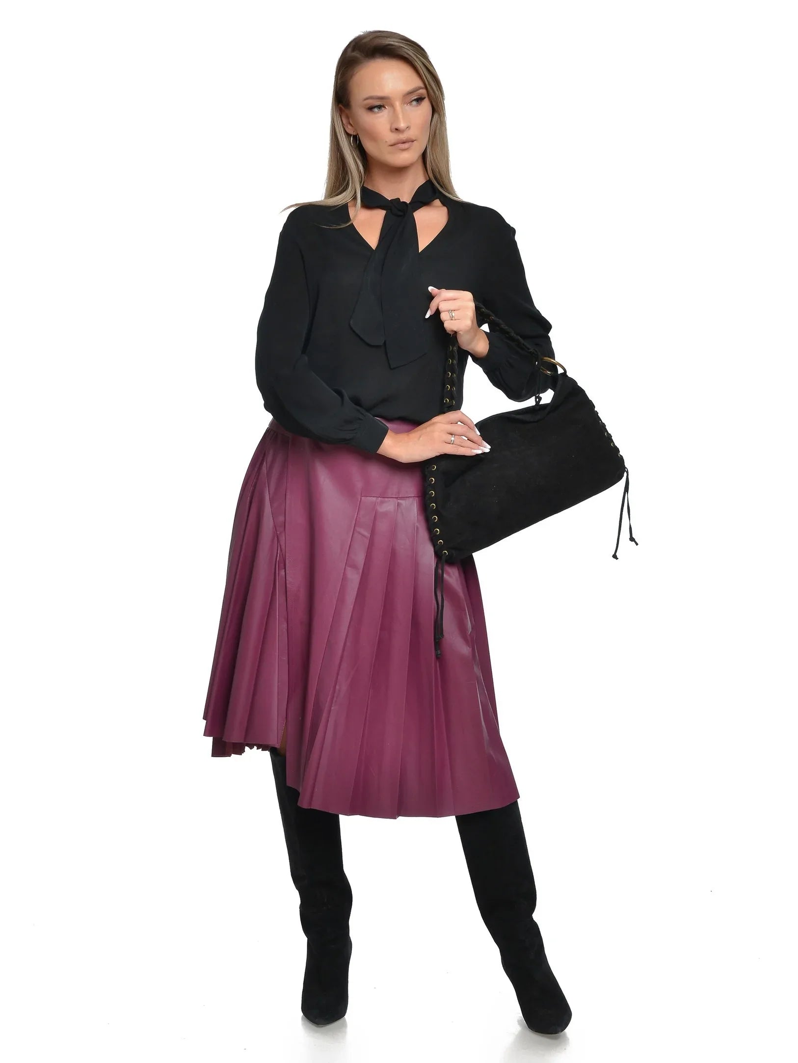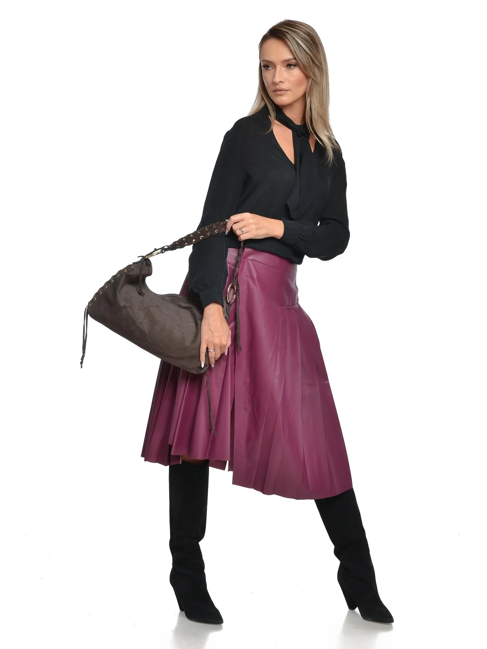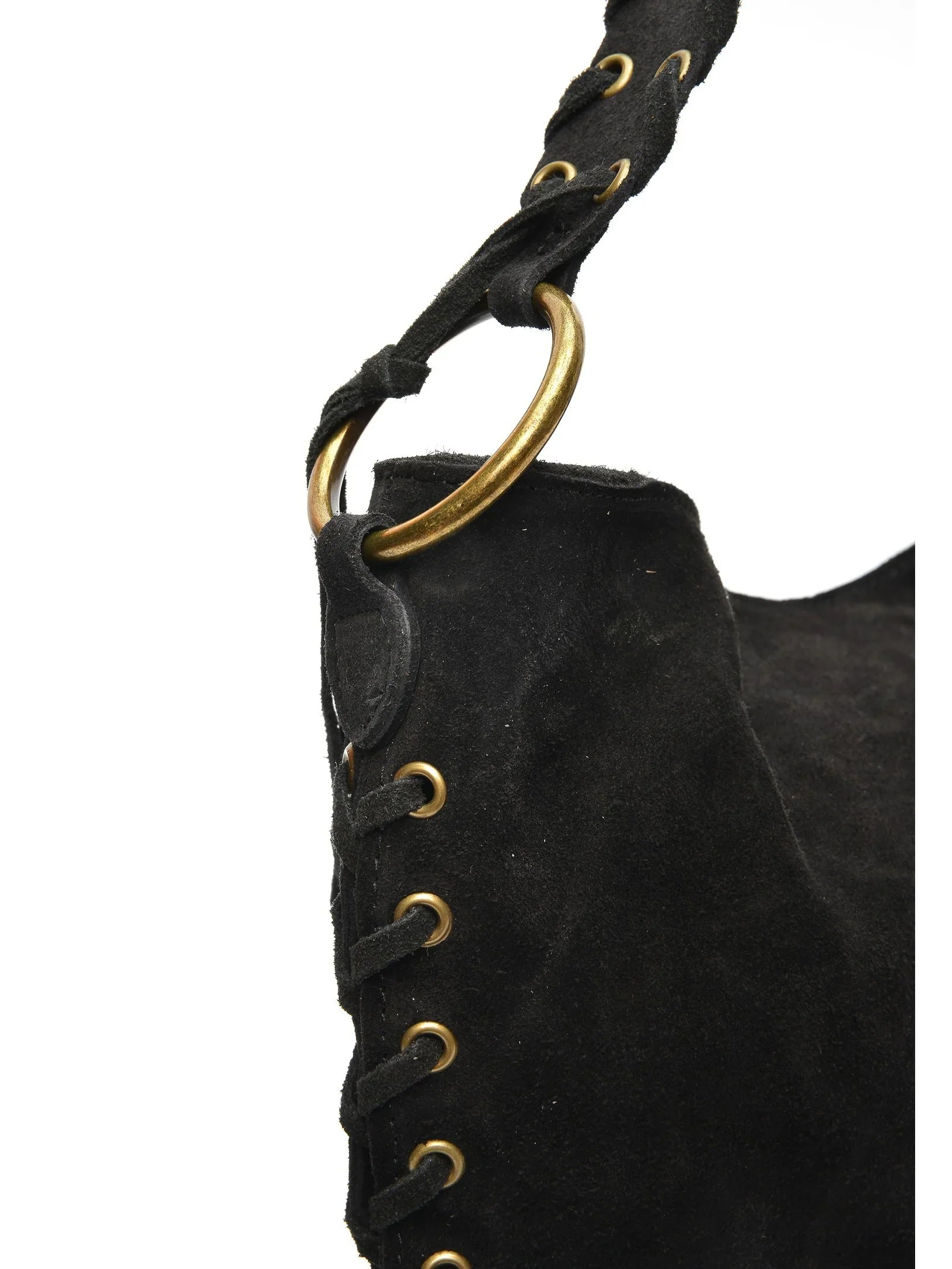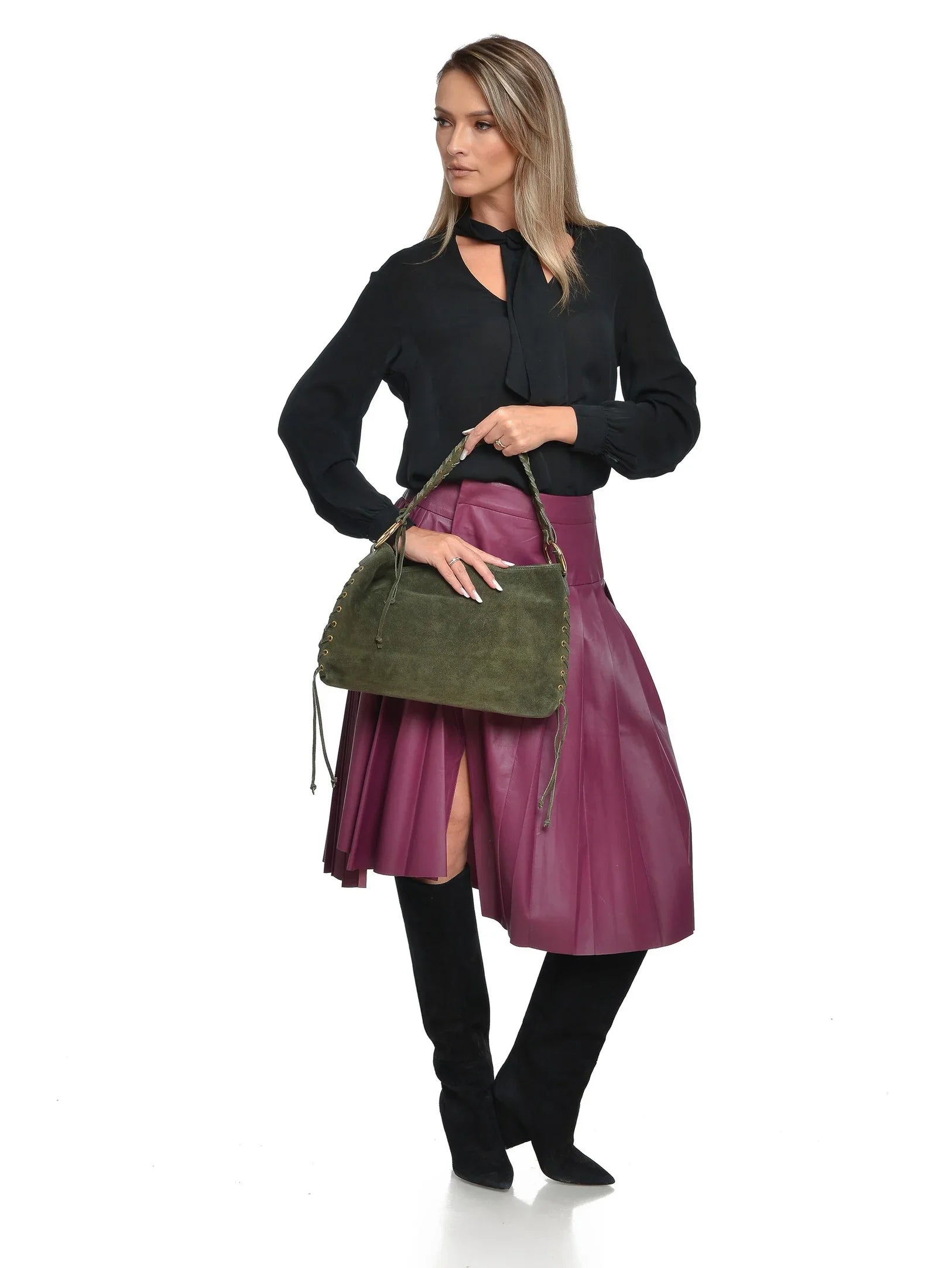 Eine großzügige Umhängetasche aus luxuriösem Wildleder mit geflochtenem Schulterriemen und Ringdetail. Der Magnetverschluss mit Reißverschluss und das stoffgefütterte Innenfutter bieten sichere Aufbewahrung für Ihre Wertsachen.