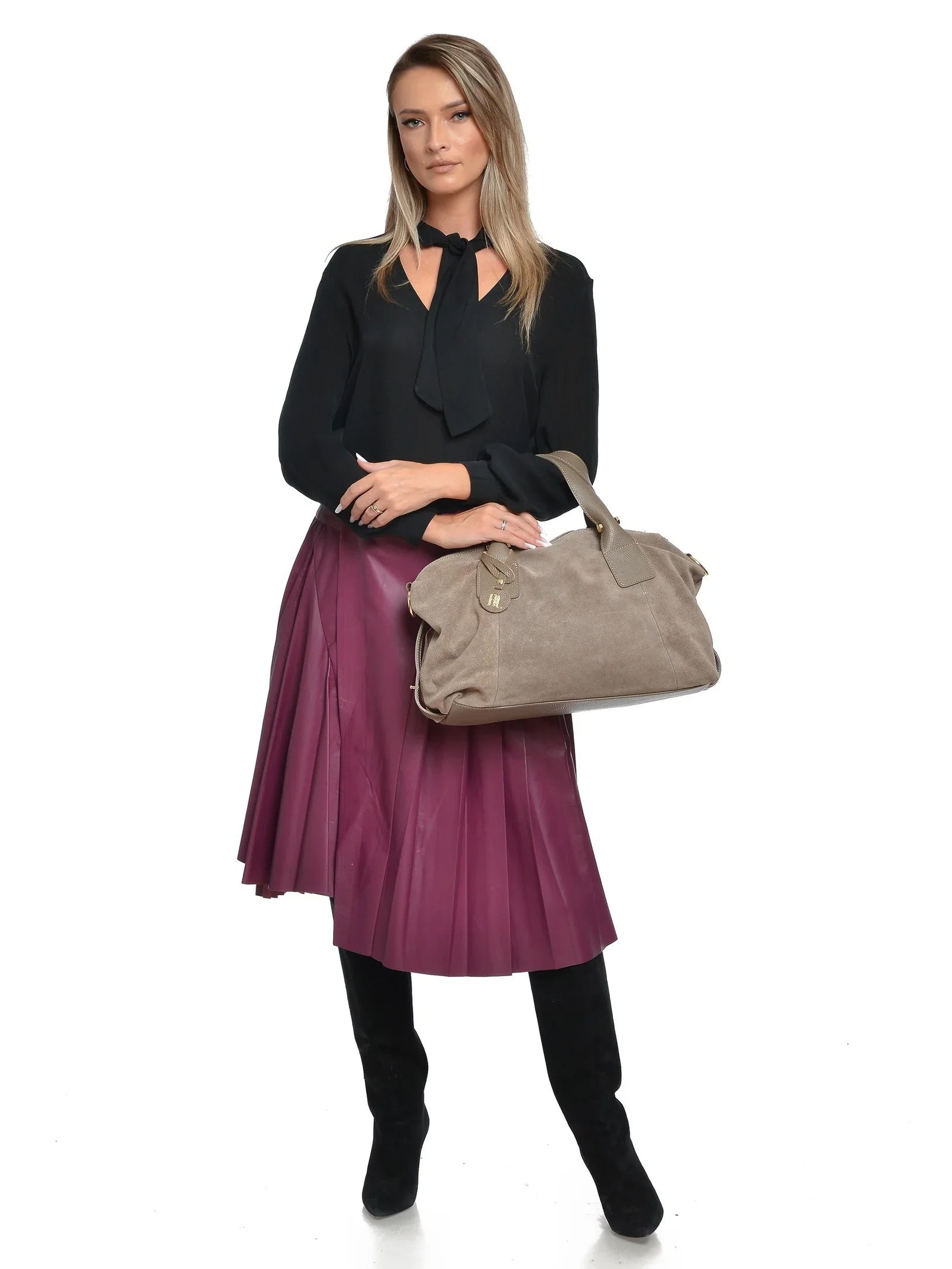 Eine elegante Handtasche mit Henkel aus luxuriösem Wildleder mit genarbtem Lederbesatz. Das stoffgefütterte Innenfutter und der verstellbare Schulterriemen machen diese Tasche zum perfekten Begleiter für jeden Anlass.