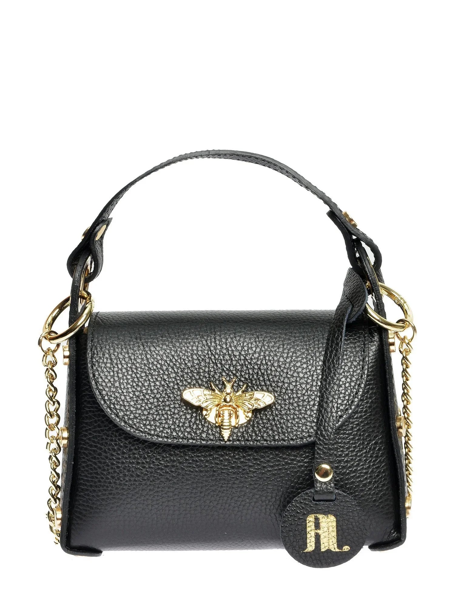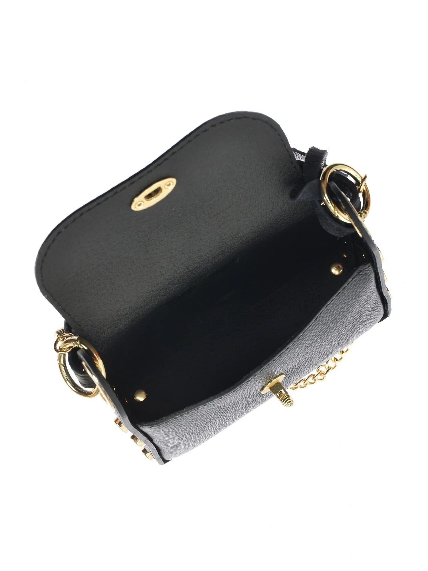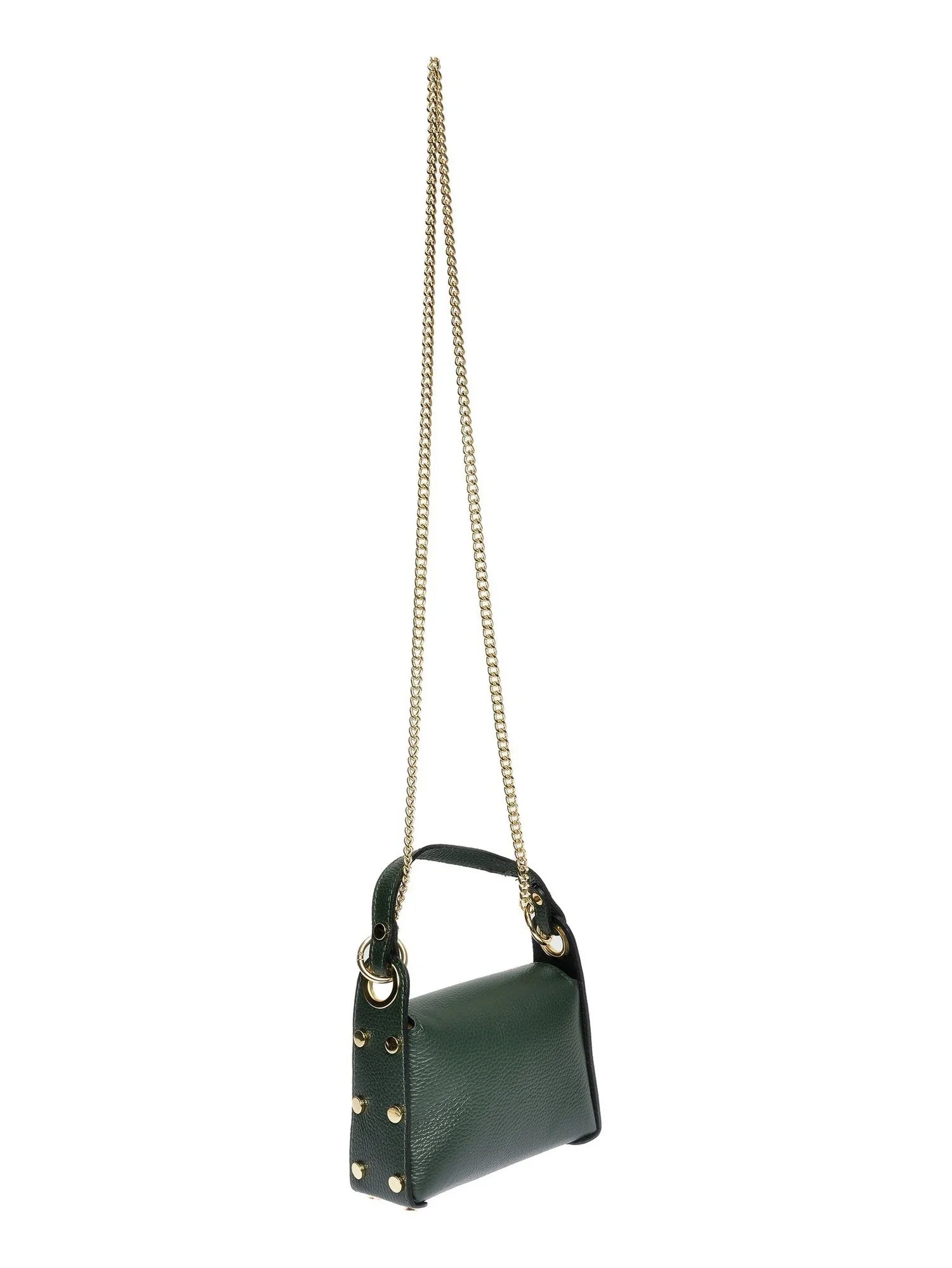 Eine kompakte Handtasche mit Henkel aus feinstem Rindsleder mit stilvollem Schnallenverschluss. Die Nietenverzierung an den Seiten und der Schulterriemen mit Kette verleihen dieser Tasche einen einzigartigen Look.