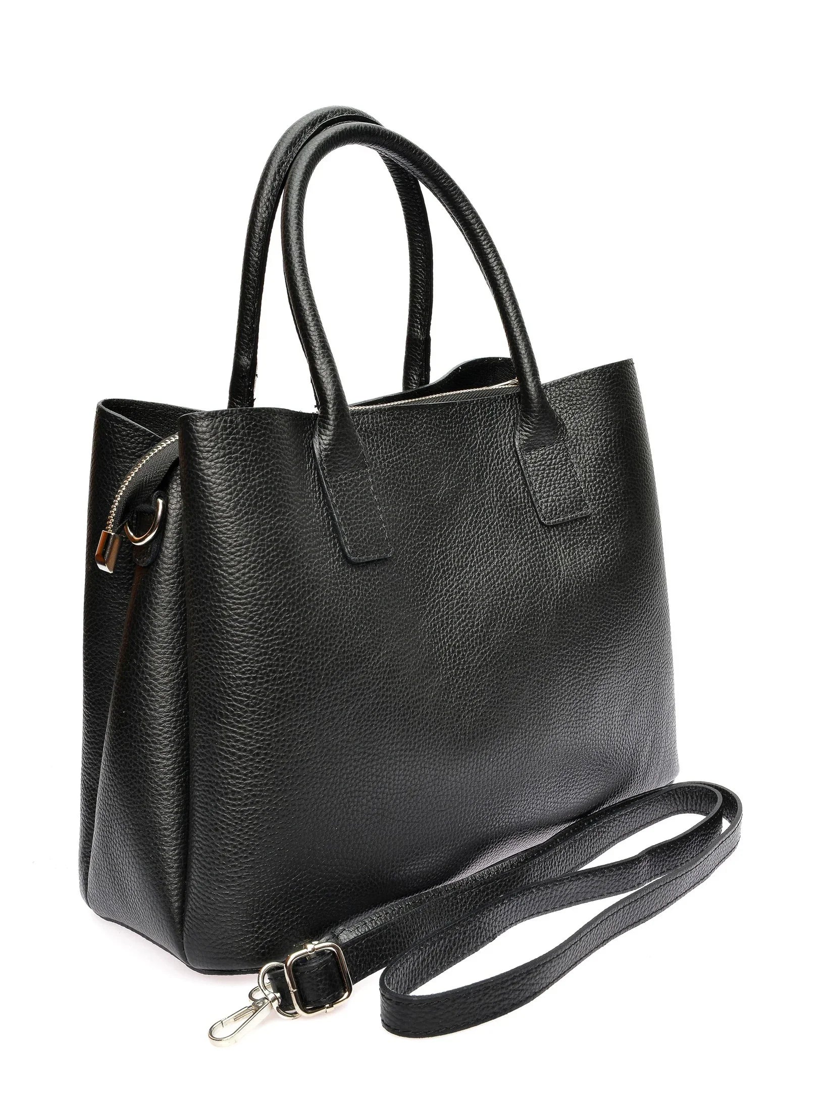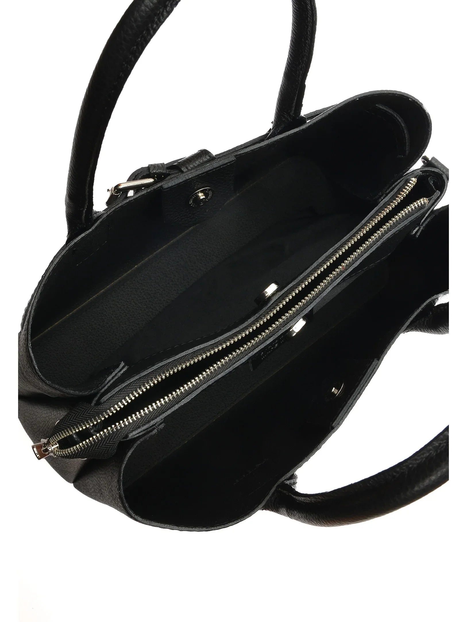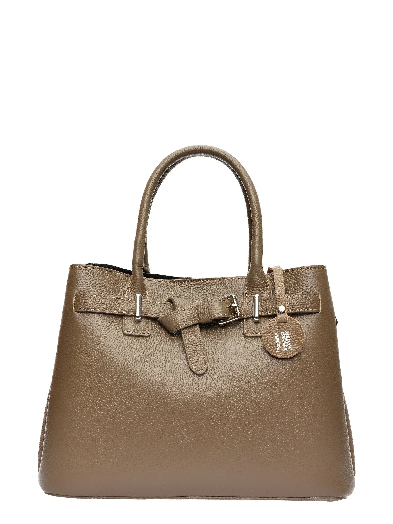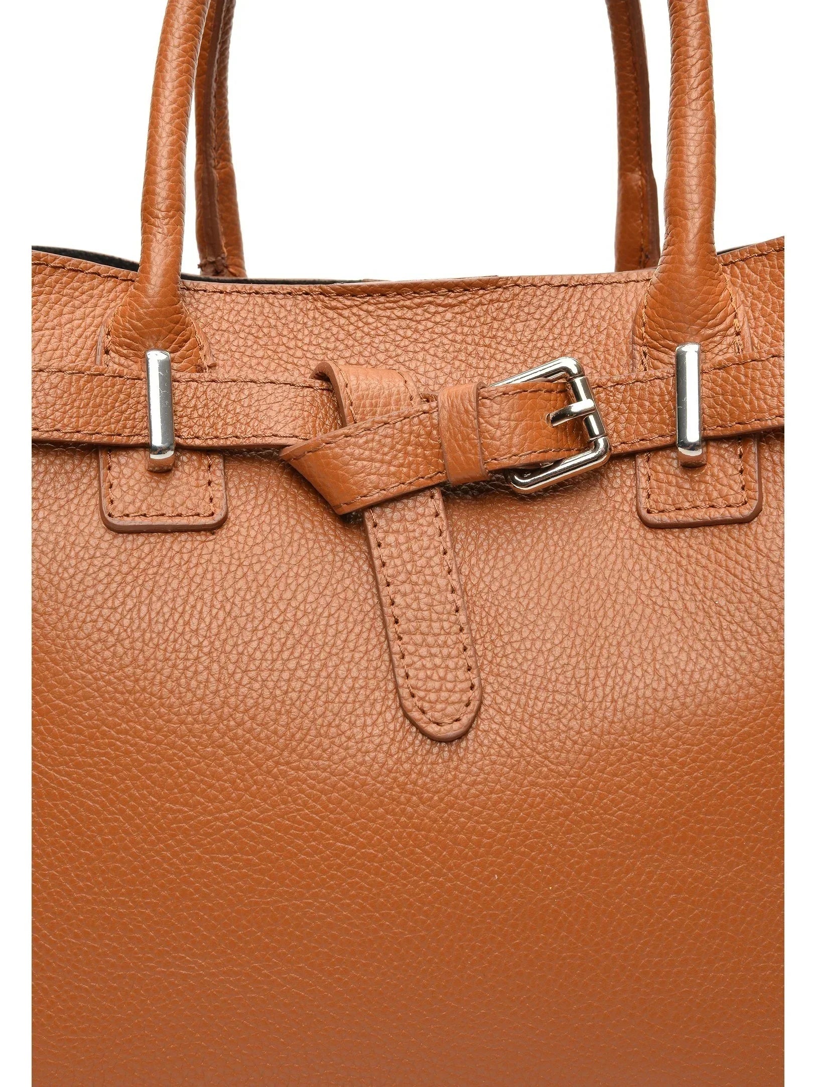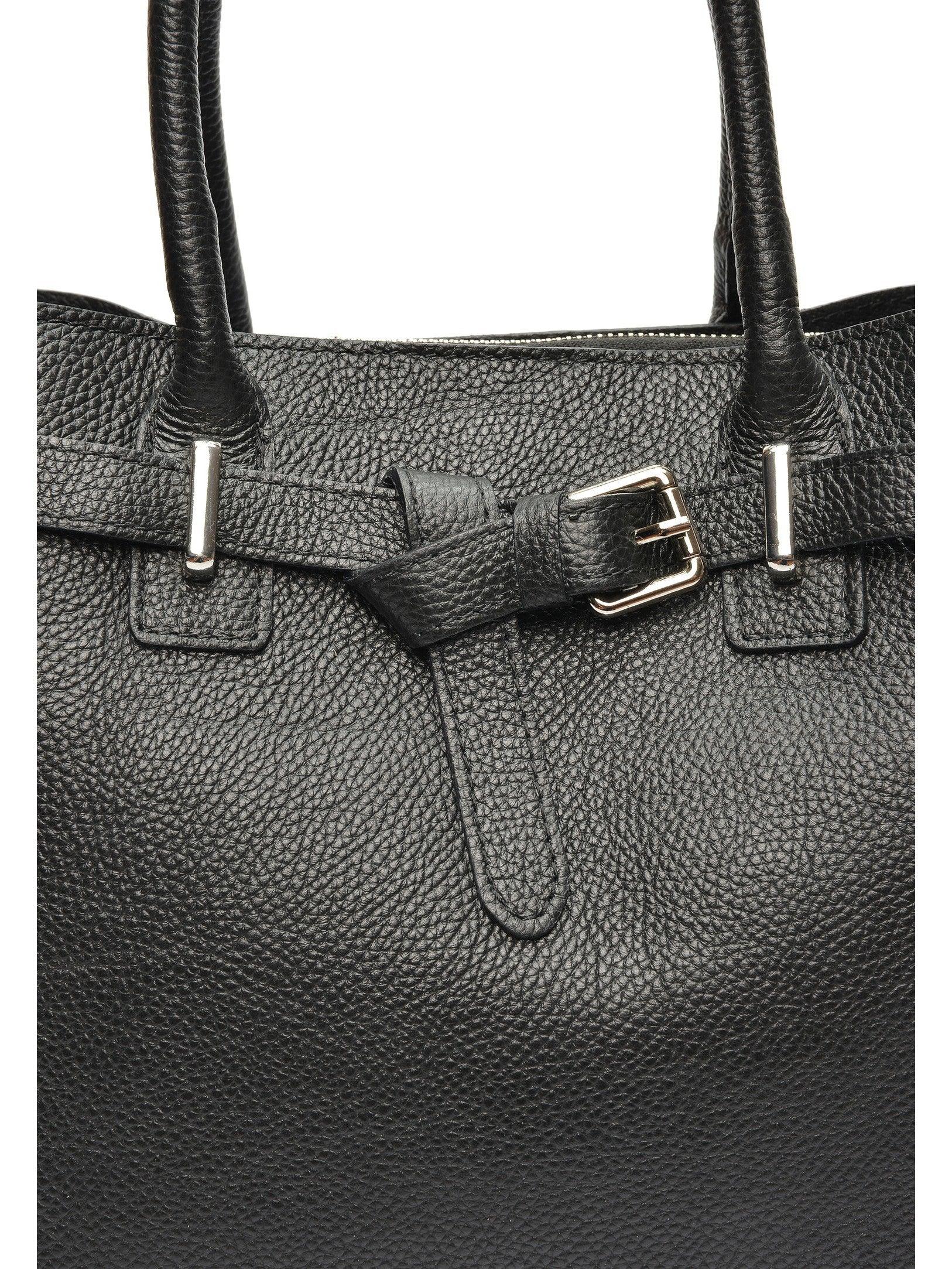 Eine stilvolle Tragetasche aus genarbtem Leder mit dekorativem Gürteldetail vorne. Das stoffgefütterte Innenfutter mit mittlerem Reißverschlussfach bietet sichere Aufbewahrung für Ihre Wertsachen.