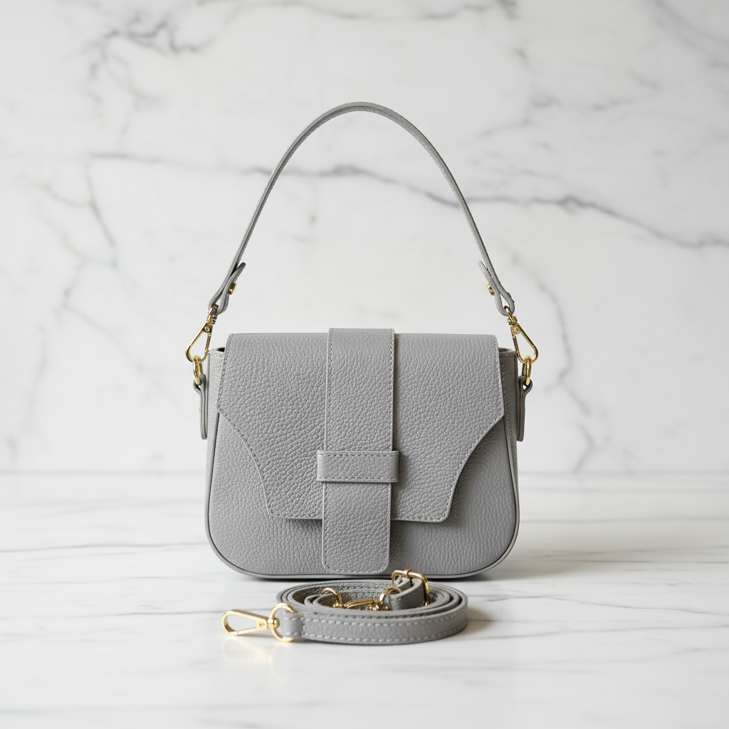 Elegante Umhängetasche aus echtem Leder in elegantem Grigio mit stilvoller Klappe und dekorativem Verschluss – zeitlos, kompakt und perfekt für jeden Tag.